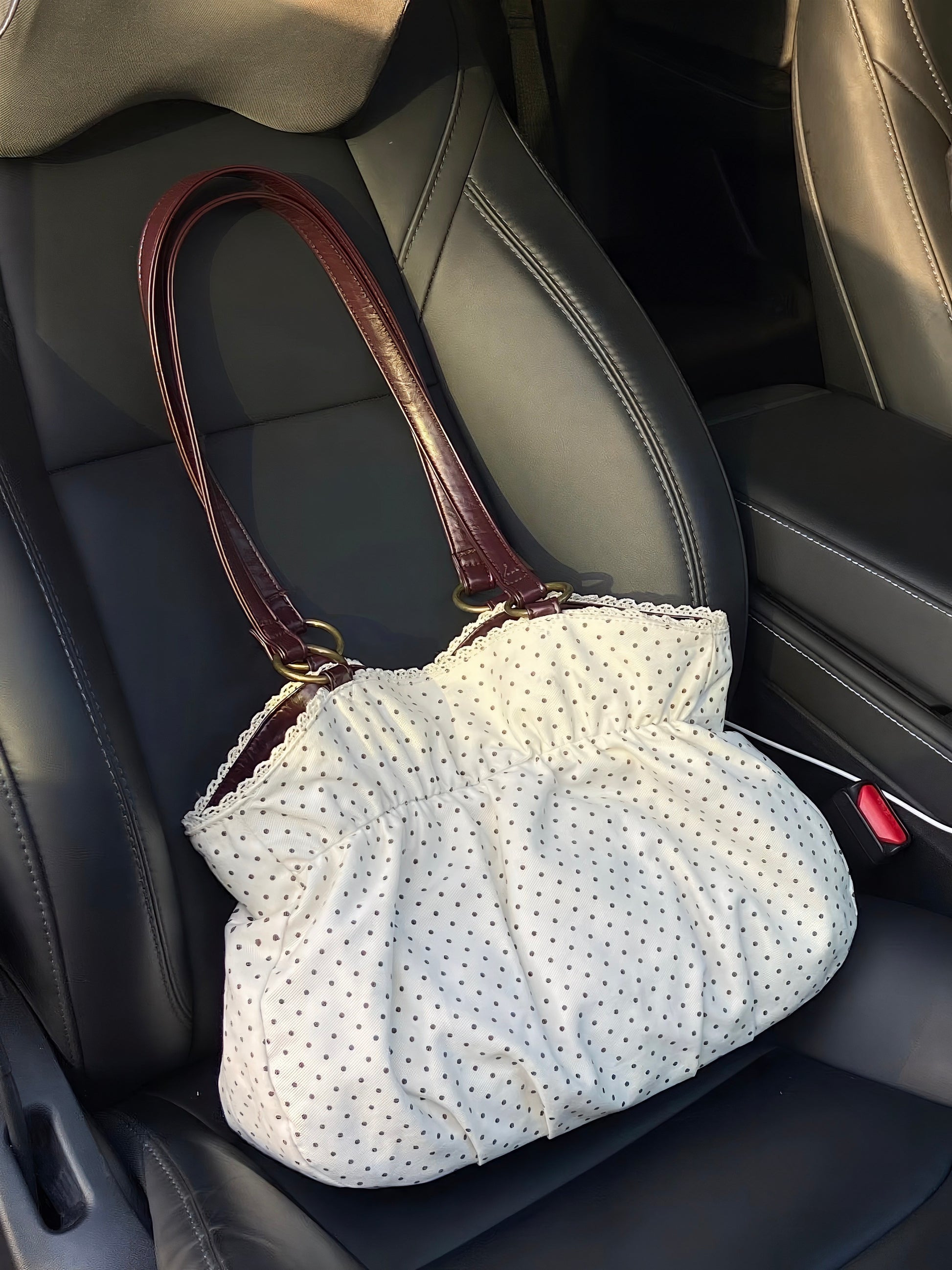 A chic retro tote with a soft polka-dot body and a bold statement bow design. Spacious, lightweight, and perfect for daily commuting with an artistic vintage touch.
