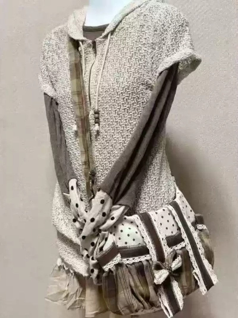 A cute patchwork tote featuring polka dots, plaid, lace trim, and an attached plush bear. Soft canvas structure with roomy capacity makes it perfect for daily use, commuting, or casual outfits.