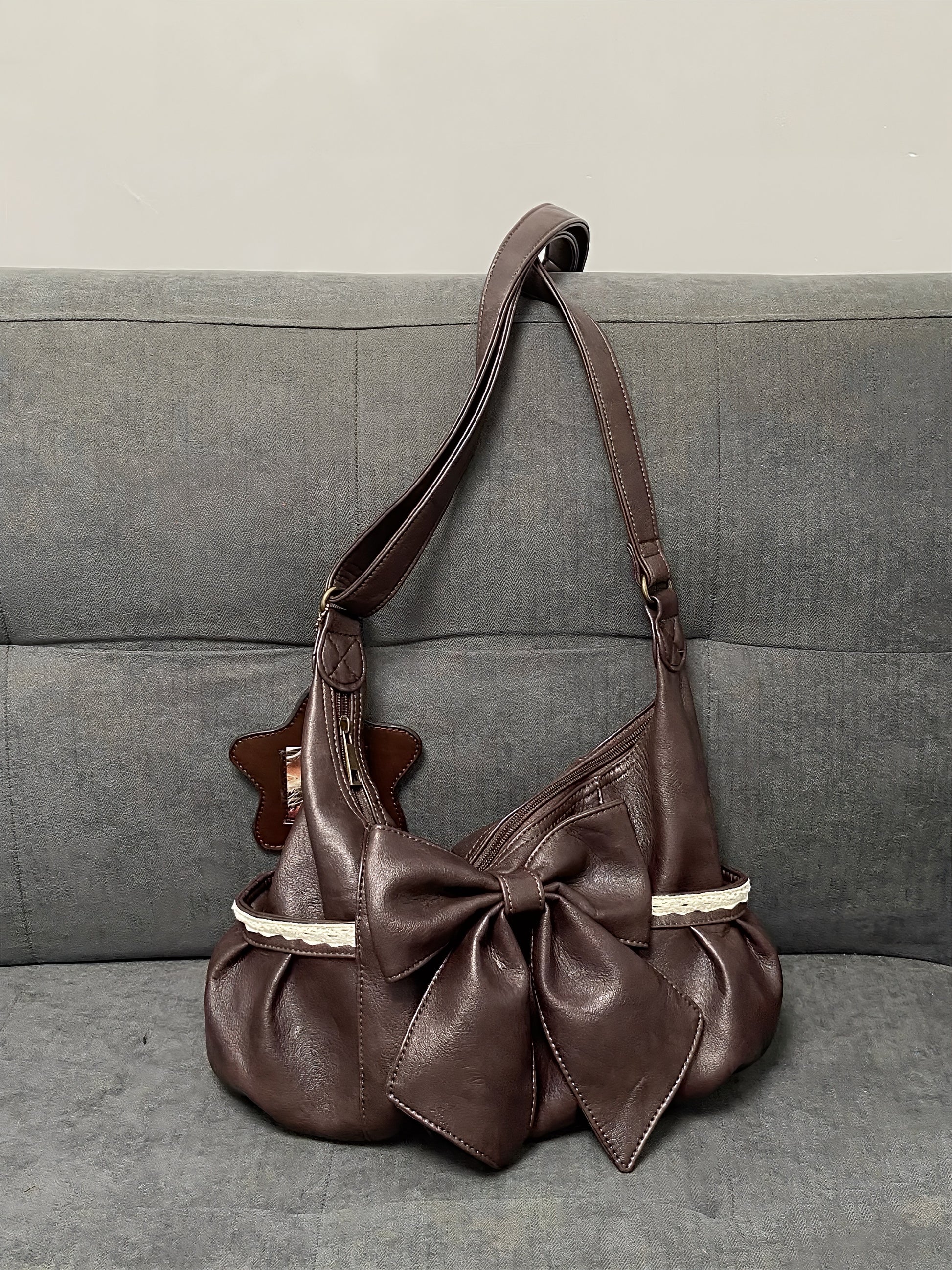 The Mocha Lace Shoulder Bag blends soft vintage charm with everyday practicality. Designed in a deep cocoa brown, it features an oversized statement bow that instantly elevates any outfit. The subtle lace trim adds a delicate feminine touch, creating a perfect balance of cute and classic.